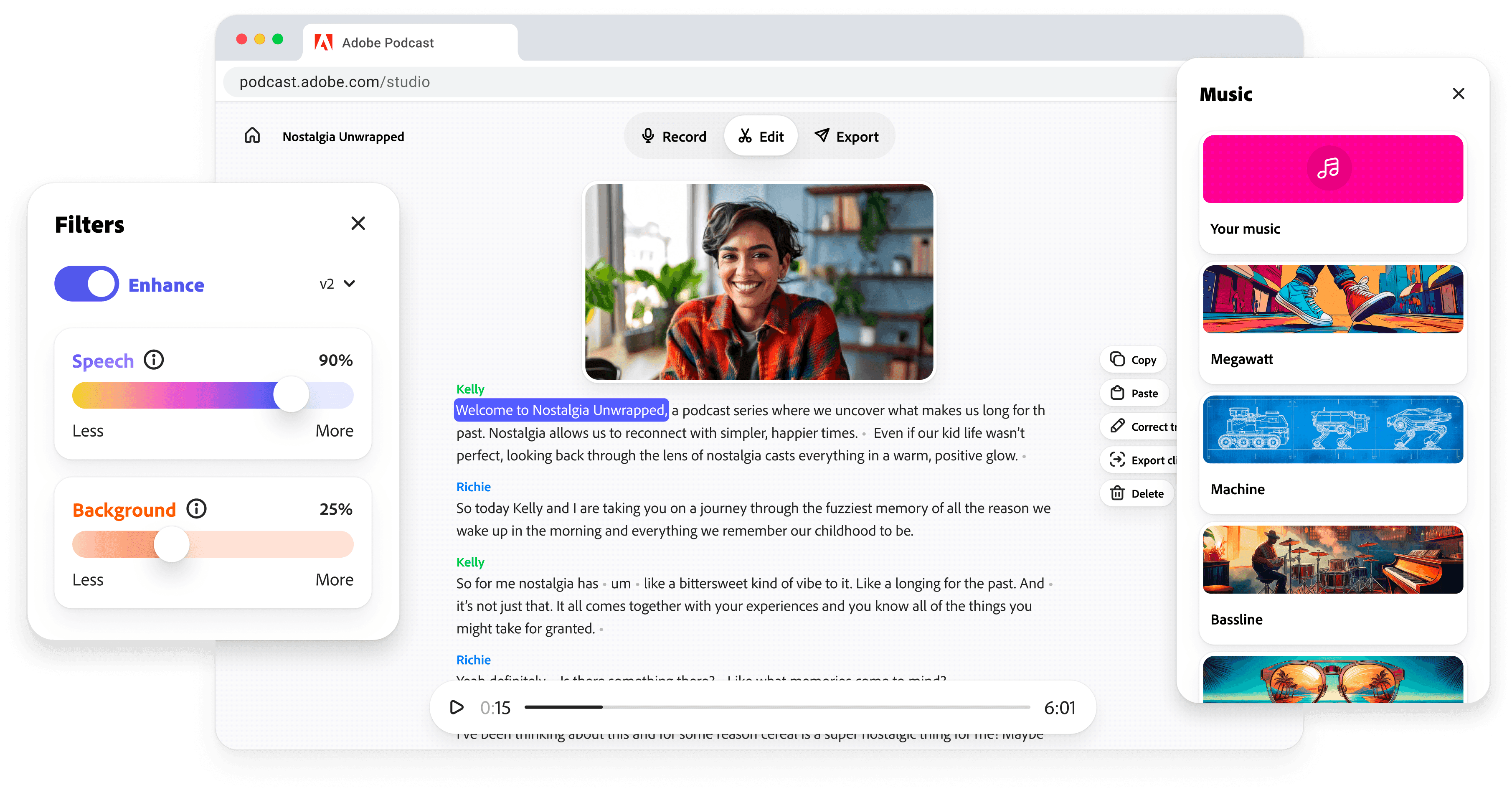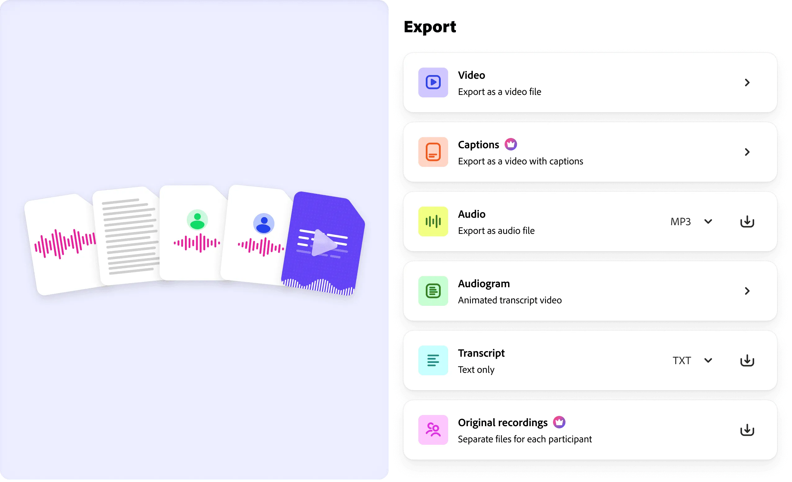 We built Adobe Podcast to be medium-agnostic. It isn't a video or audio tool, it's a storytelling tool. So when it comes to exports, creators can choose the medium that serves their story best. Share a clip, add captions, get the transcript, or even download the source files.